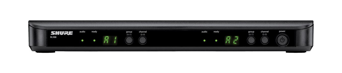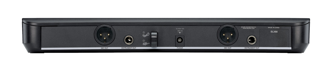 Shure BLX88 is a dual channel wireless receiver that has all the features of the BLX4 duplicated across its two channels. A single power supply input is positioned on the rear facing panel.