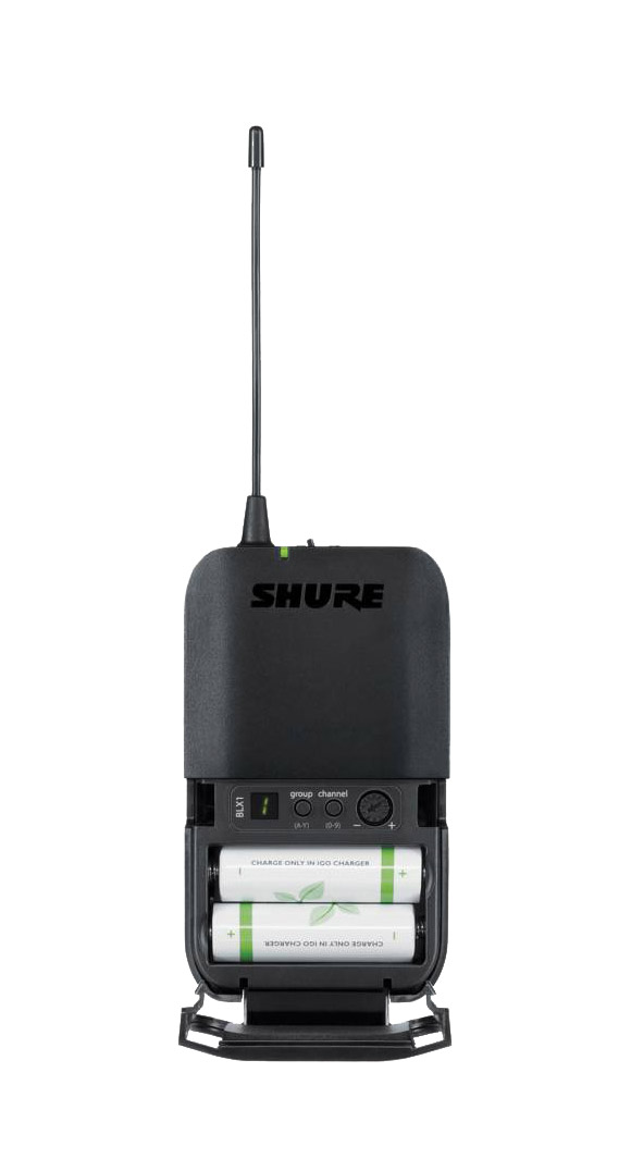 Shure BLX1 beltpack transmitter has all the functionality of the BLX2 handheld transmitter, however it is designed to be used with plugin microphones including SM31FH or SM35 headworn microphones, MX153 mic, or CVL lavalier mic. All function buttons are located within the battery compartment, which also uses two AA alkaline battery cells for operation up to 14hours. The upper edge of the beltpack transmitter has a fixed whip antenna, and 4-pin TA4 microphone input.