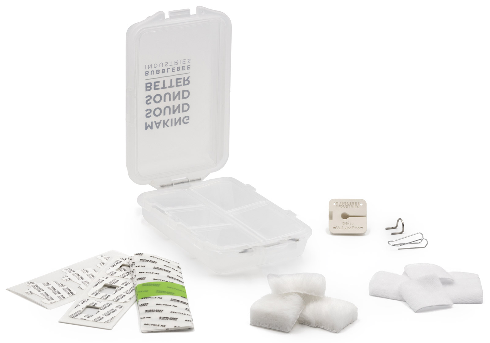 Bubblebee have designed this kit for those engineers who are looking for a variety of options without knowing which is best for their needs. The kit includes 3x Invisible Lav Covers Fur Outdoor (1x black, 1x white, 1x beige), 3x Invisible Lav Covers Original (1x black, 1x white, 1x beige), 9x Invisible Lav Covers Moleskin (3x black, 3x white, 3x beige), 15x Invisible Lav Tape, 5x Invisible Skin Tape, and 1x Accessory Case.