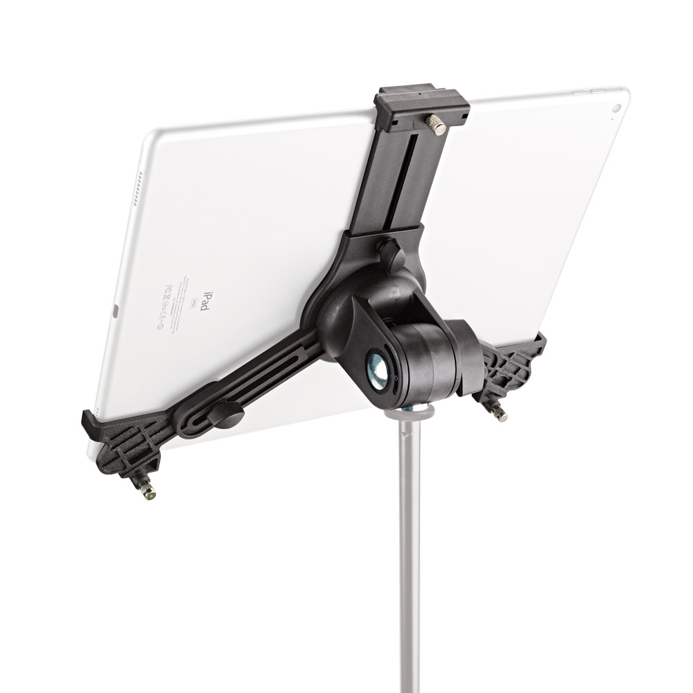 A universal tablet holder with clamping mechanism for tablets measuring 10-16inches horizontal and 7-13inches vertical. The clamping range of this Bio-based plastic accessory is 155-307mm and is therefore able to mount a tablet in vertical or horizontal orientation. This mount is non-rotatable however it does allow for front to back tilt adjustment. A standard 3/8-inch thread connects to microphone stands and accessories. Weight: 0.334kg