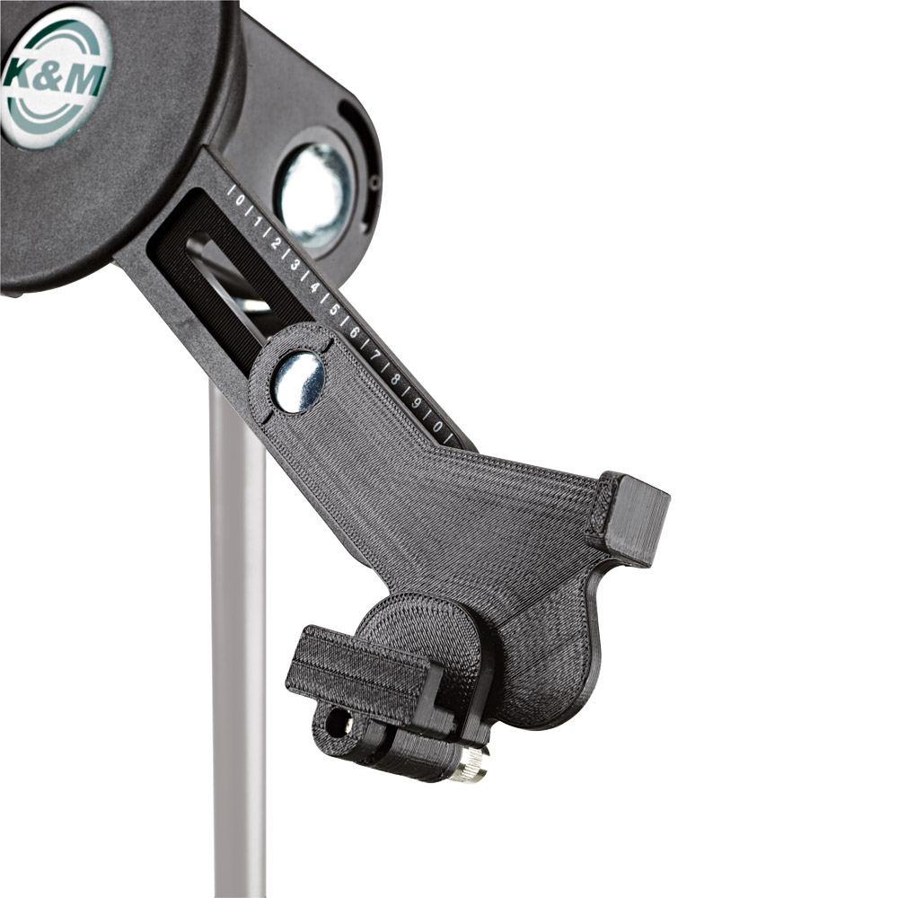 A universal tablet holder that aids the mounting of tablets between 10-16 inches. The tablet holder adds to K&M's list of Bio-based plastic products. Bio-based plastic products are manufactured from 50 to 100%, plant-based renewable raw materials, such as corn starch, beet sugar, and vegetable oils, thus helping to reduce CO2 emissions and limited petroleum resources. The clamp is adjustable from 158-280mm in height, and 150-330mm in width, and can be positioned in landscape or portrait orientation. A standard 3/8-inch thread connects to microphone stands and accessories. Weight: 0.41kg