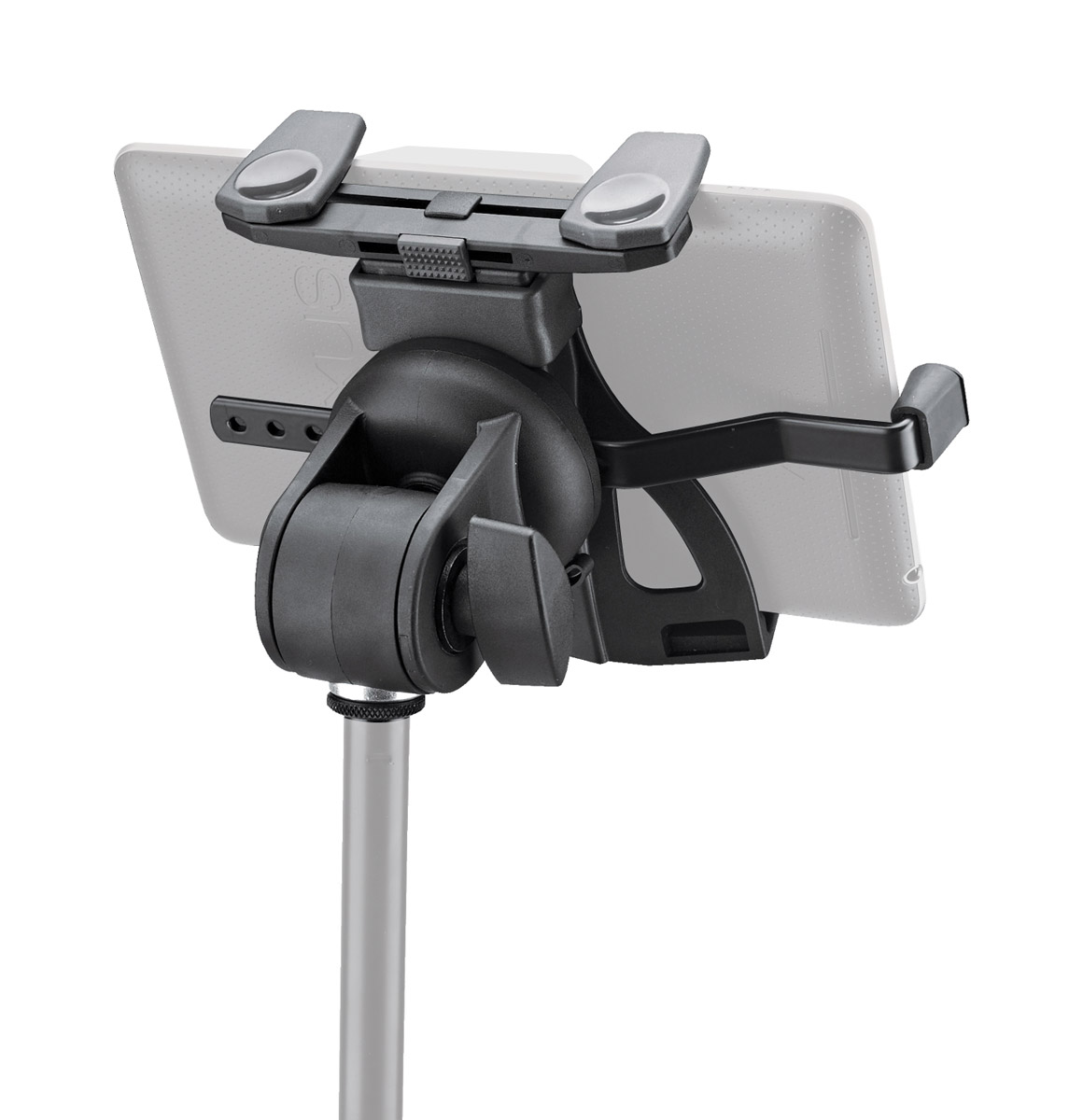 A universal tablet holder with clamping mechanism for tablets measuring 10-16inches horizontal and 7-13inches vertical. The clamping range of this Bio-based plastic accessory is 155-307mm and is therefore able to mount a tablet in vertical or horizontal orientation. This mount is non-rotatable however it does allow for front to back tilt adjustment. A standard 3/8-inch thread connects to microphone stands and accessories. Weight: 0.334kg