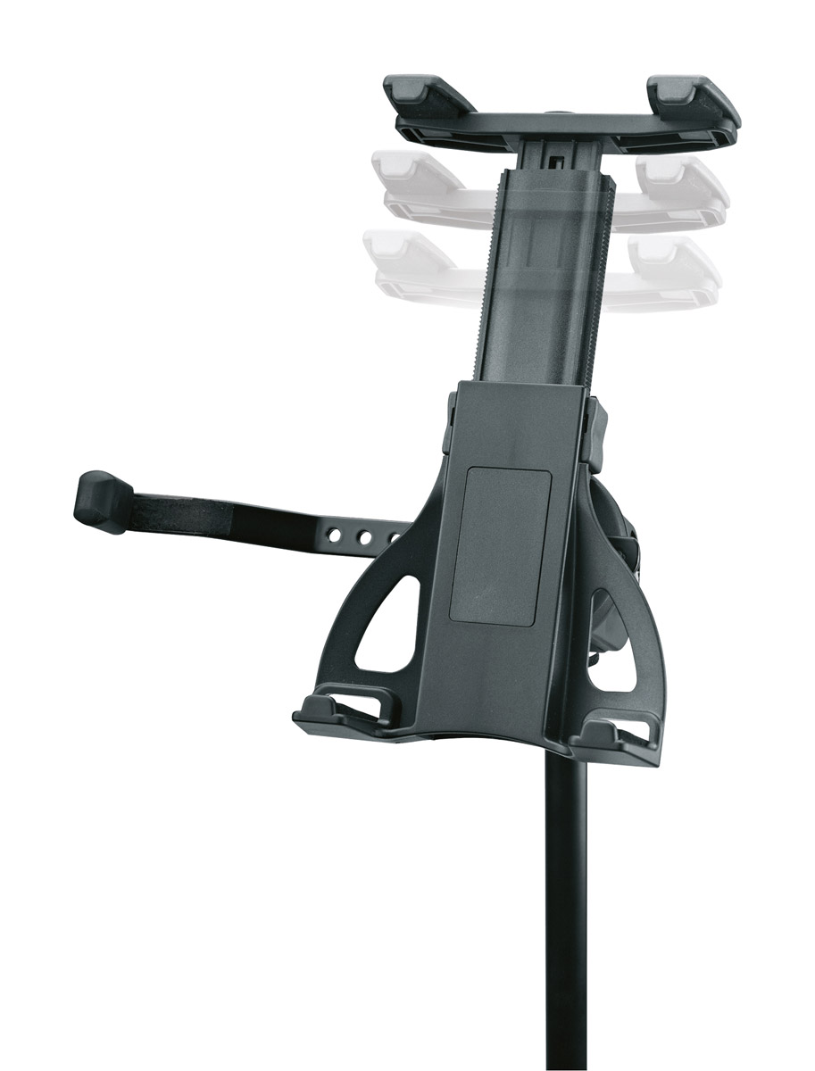 A universal tablet holder with clamping mechanism for tablets measuring 10-16inches horizontal and 7-13inches vertical. The clamping range of this Bio-based plastic accessory is 155-307mm and is therefore able to mount a tablet in vertical or horizontal orientation. This mount is non-rotatable however it does allow for front to back tilt adjustment. A standard 3/8-inch thread connects to microphone stands and accessories. Weight: 0.334kg