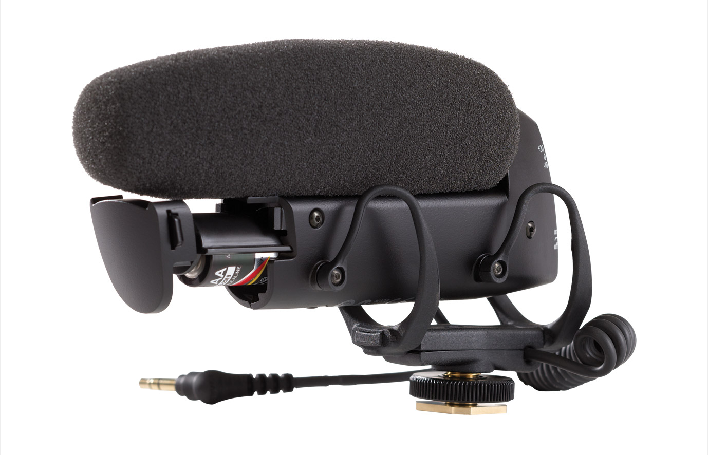 This electret condenser, shotgun style microphone features a tight supercardioid/lobar pickup pattern and as a by-product rejects unwanted, off-axis noise. The microphone is mounted on an integrated lyre shockmount, designed by Rycote, to reduce handling noise caused by vibrations. The suspension is in turn mounted on a standard size cold shoe adapter with 0.25 inch threaded base.