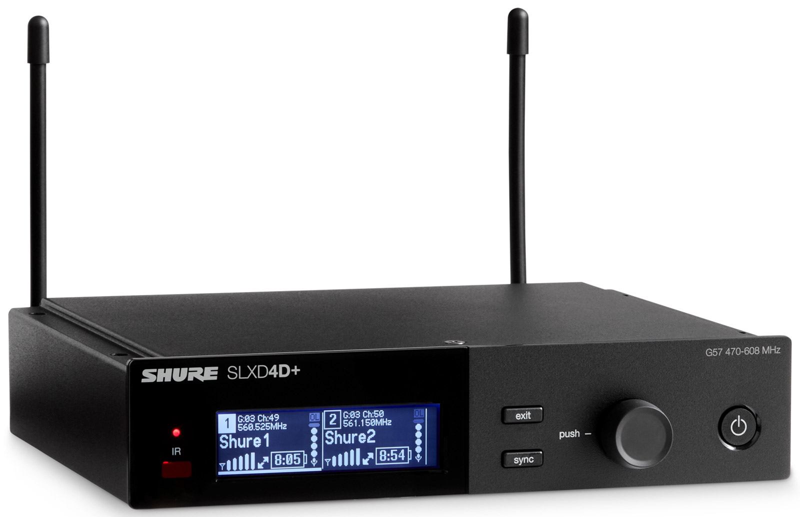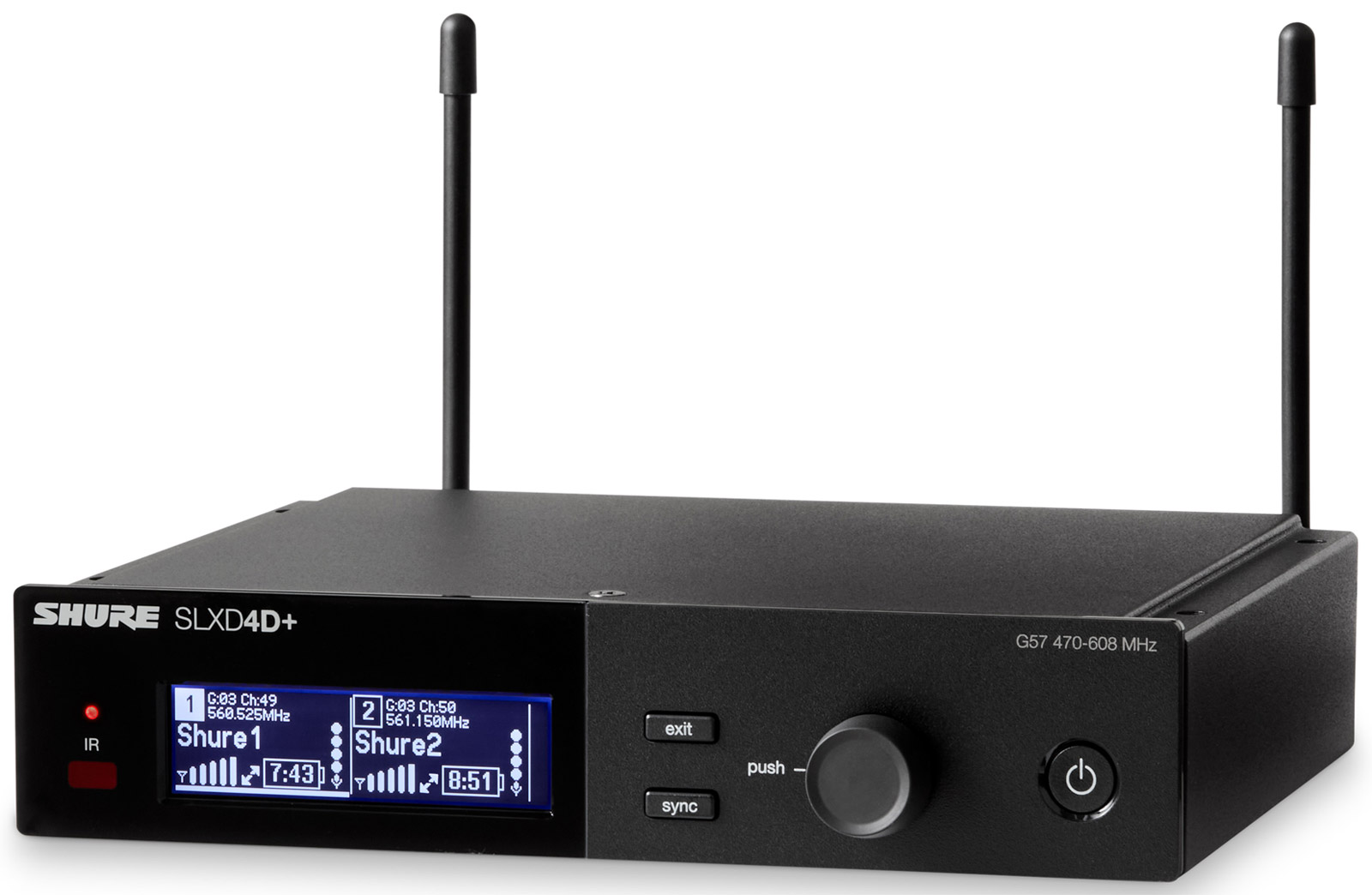 The front facing panel of the SLXD4 receiver has all status identifying tools including a flashing/solid LED for sync status, and visual display showing both receiver and linked transmitter settings along with menus for adjustment. Power button, control knob, sync and exit buttons are also located on the front facing panel, along with an infrared port for syncing with selected transmitter.