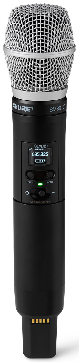 This handheld transmitter is able to transmit a frequency range of 20Hz to 20kHz with flat response, however each mic capsule offers a different frequency response curve. Usage is up to eight hours continuous with 2x AA alkaline batteries, or a single SB903 lithium battery pack can be used to gain monitoring information including battery health, status, and remaining charge in hours and minutes. External charging contacts on the base of the microphone allow the recharging of the SB903 batteries when used with the compatible Shure SBC203 charging unit. Like the SLXD1+, the SLXD2+ offers OLED screen that shows important information including group/channel and frequency. Lockout functions are accessible by navigating the user menu.