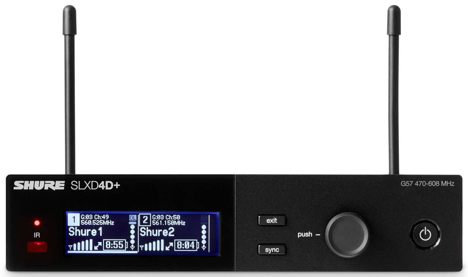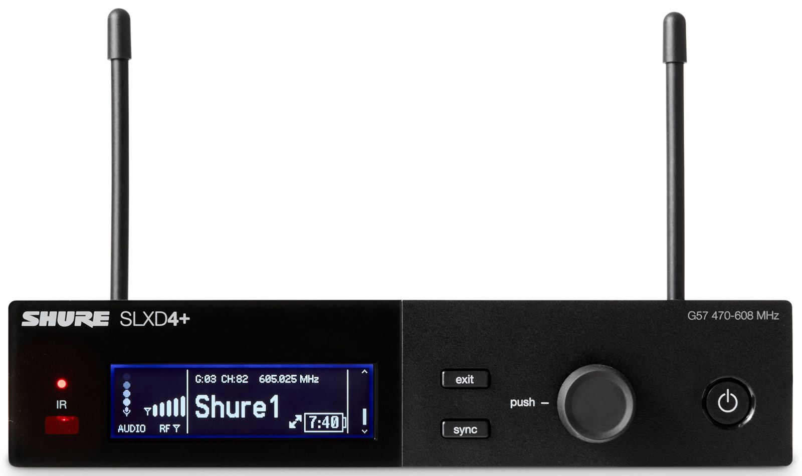 The front facing panel of the SLXD4 receiver has all status identifying tools including a flashing/solid LED for sync status, and visual display showing both receiver and linked transmitter settings along with menus for adjustment. Power button, control knob, sync and exit buttons are also located on the front facing panel, along with an infrared port for syncing with selected transmitter.