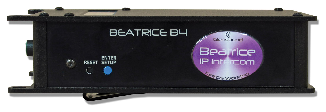 Glensound Beatrice system is a range of network audio intercom devices utilising the Dante/AES67 network AoIP standards for transmission of real time uncompressed audio across networks. The range includes, beltpacks, desktops and rackmount units from 1-16 channels. There is also a number of peripheral units including a 'flasher' unit, a walkie-talkie interface, a 2 wire party line interface for RTS, Clearcomm and Tecpro, talkback wall plate positions, PoE amplifiers, PoE speakers and an intercom mixer - all on Dante/AES67 networks.
