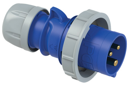 Available in splashproof IP44 or watertight IP67 variants the standard blue/grey connector housing is manufactured from Polycaprolactam (PA6) with brass contact pins and are rated 220 - 240V AC, 16 amp, 32 amp or 63 amp, 2-pole plus earth.