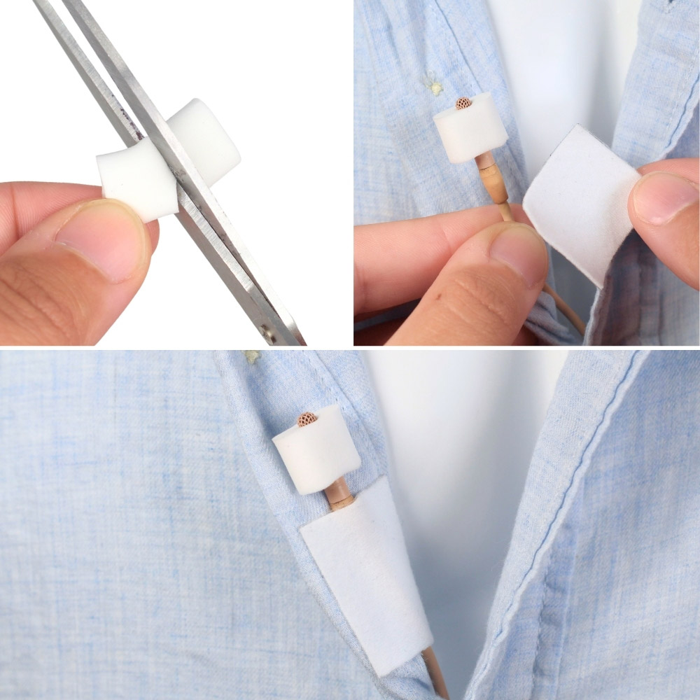 Foamies measure 25mm in length, 14mm in width, and 9mm tall, however they can also be cut to size. The diameter of the hole is 3.5mm, stretchable to fit microphones including DPA 4060/4071, Rode Lavalier, Sanken COS11, and Sennheiser MKE2/ME2.