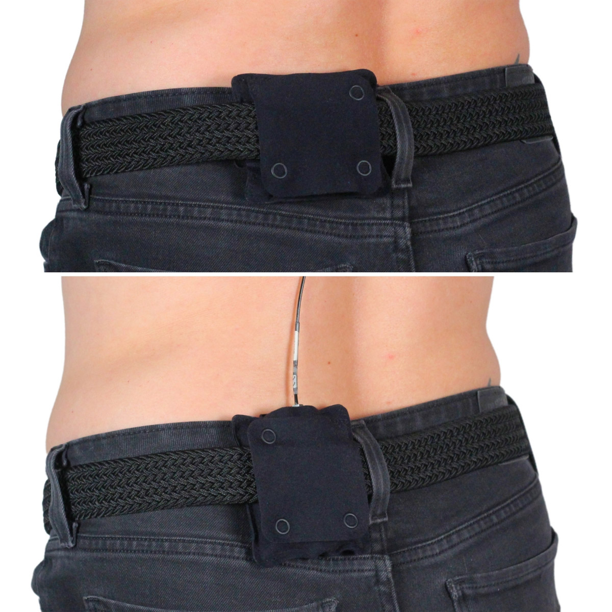 Live Pouches are designed for quick setup for musicians, singers, speakers, and event staff. The pouches have a quick release loop that enables the user to secure the pouch to a belt or guitar strap. The pouch is made with bonded fabric measuring 1mm in thickness that allows stretching whilst remaining comfortable for the user. A hook and loop tab ensures the wireless pack concealed is secure.