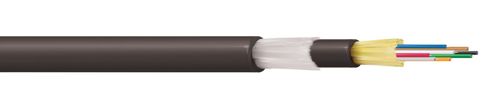 Tight buffered construction exhibiting excellent impact and crush resistance. PUR outer and inner jackets offer flexibility as well as abrasion and chemical resistance with swellable glass yarns between the two jackets acting as additional strength members. Beneath the inner jacket is a swellable yarn which expands if it comes into contact with water and seals minor cuts or punctures. This compact round cable is easily reeled and has a low shape memory. Available with 2, 4, 6, 12, or 24 cores. These multimode versions have a 50/125 OM3 core optimised for 850nm and 1300nm suitable for transmission rates up to 10Gbit/s.