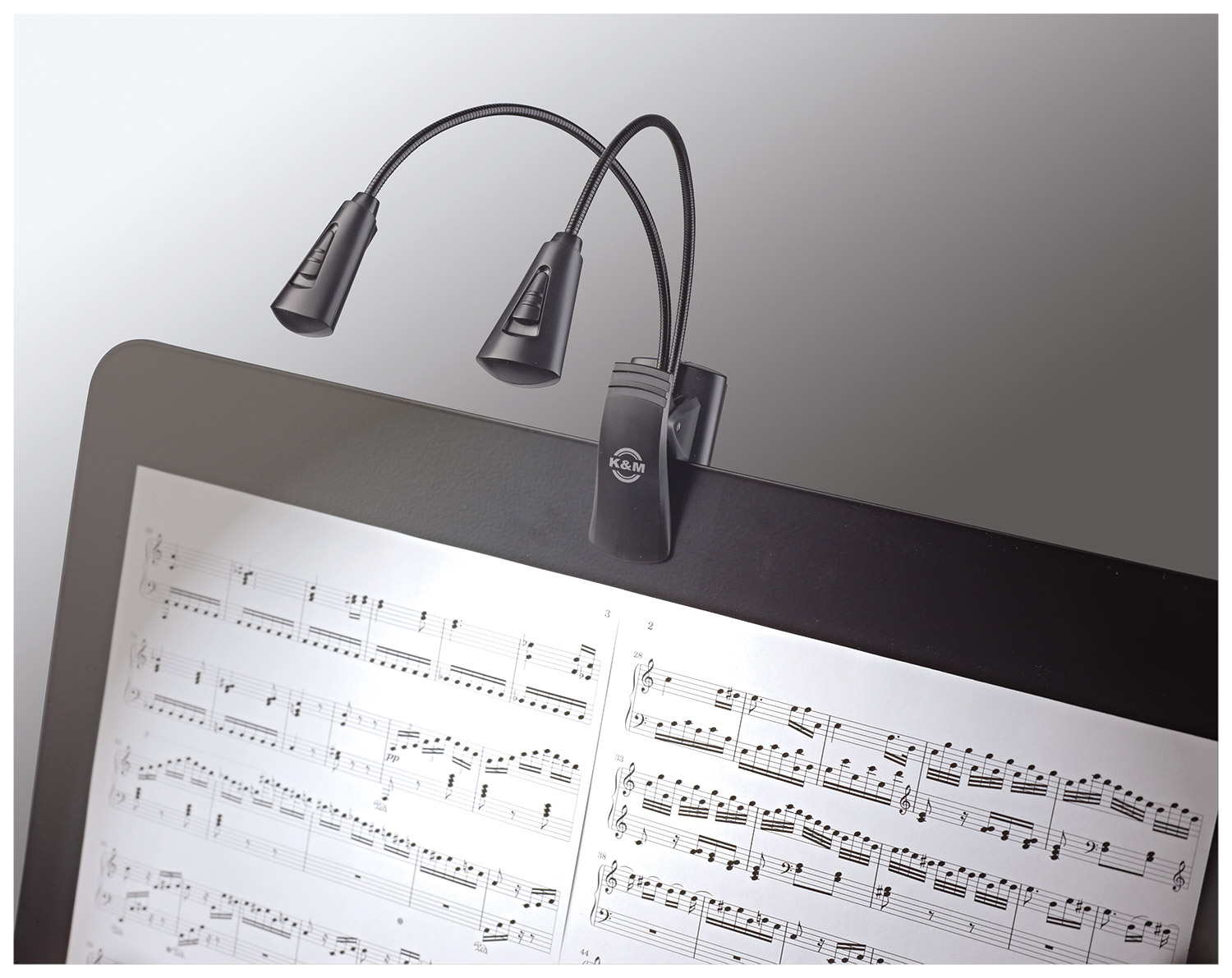 A plastic manufactured, battery/mains operated music stand light with two lamp heads, each with 4x LEDs providing a total of 3400 lux. A switch allows the user to switch between two pre-set brightness levels. A gooseneck connects the LED lamp heads to the base clamp, which has a clamping range of up to 25mm. The lamp can be operated via 3x AAA battery cells or mains power via the optional 12257 power adapter. The optional 12256 Base FlexLight can be connected to enable freestanding use or mounting via integrated magnet. Weight: 150g.