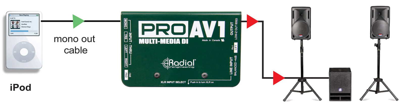 Radial ProAV2 is a dual channel passive direct box designed specifically for the audio-video professional where ‘Swiss Army knife’ connectivity is required to meet on-the-fly demands of AV rentals and installations. ProAV2 has been designed for use with portable computers, CD players, iPods and other sound sources that must interface to PA systems alongside microphone lines.