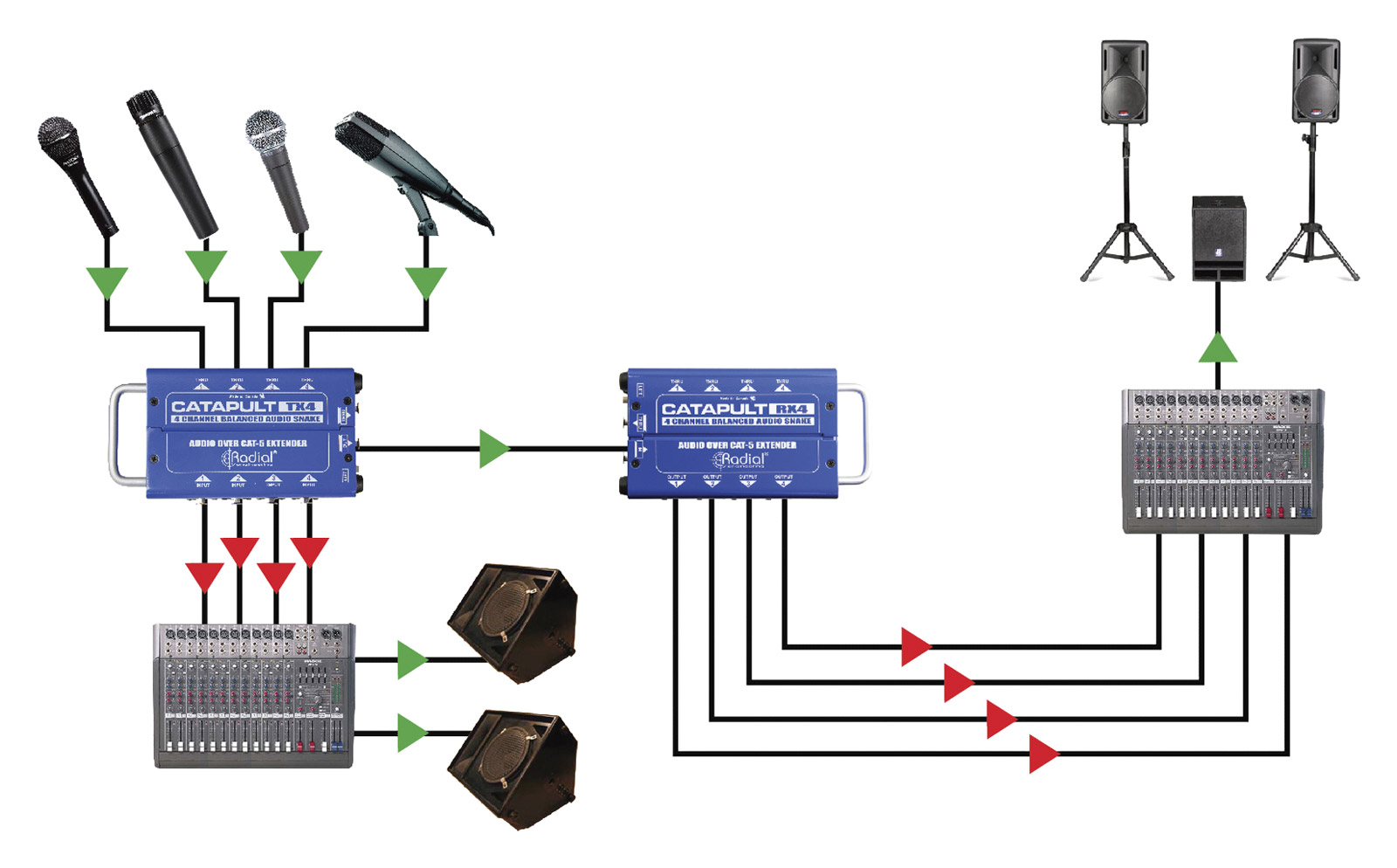 A series of audio over Cat 5 cable product by Radial, designed to eliminate the need for bulky and expensive multi-pair audio cable runs. They also allow the user to take advantage of pre-wired networks to connect from one room to another.