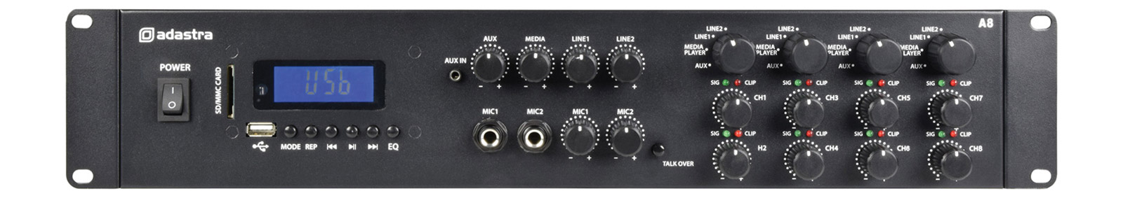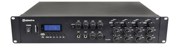 ADASTRA A8 MIXER AMPLIFIER Quad-stereo, 8x 200W, 2x mic in, USB/SD/Bluetooth media player, FM radioADASTRA A8 MIXER AMPLIFIER Quad-stereo, 8x 200W, 2x mic in, USB/SD/Bluetooth media player, FM radioADASTRA A8 MIXER AMPLIFIER Quad-stereo, 8x 200W, 2x mic in, USB/SD/Bluetooth media player, FM radio