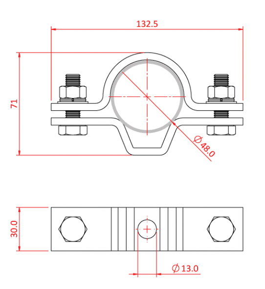 Maximum tightening torque: 30Nm. Working load limit: 750kg, vertical load. Tube diameter: 48-51mm. Weight: 0.71kg