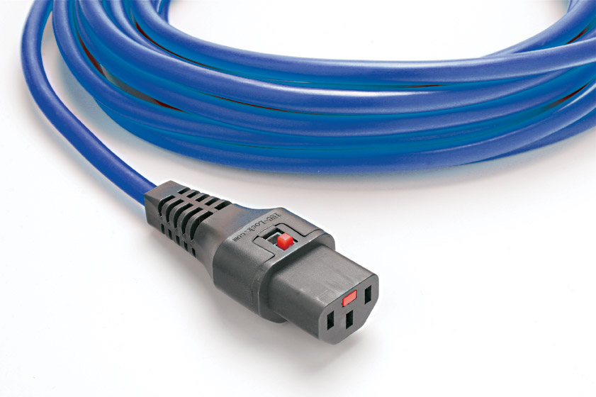 These leads use patented C13 female connectors with an internal locking mechanism which locks in an IEC power inlet, to provide a simple way of securing a power cable to any electrical equipment fitted with a standard IEC connector. They are invaluable for use with critical equipment, either free-standing or rack mounted and in areas subject to vibration such as outside broadcast vehicles, touring and ‘fly-away’ kit where standard connectors may become dislodged in transit. Ready made cables are offered terminated to standard IEC C14 male plugs, bare ends, and UK 13A and SCHUKO (right-angle) plugs.
