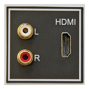 Front panel HDMI socket linked internally to a rear 90 degree HDMI socket , for use with pre-made HDMI cables. Also fitted with two gold plated RCA (phono) sockets for audio (labelled left and right) with rear panel solder connections. RCA (phono) and HDMI connections arrayed vertically. Depth required: 20mm.