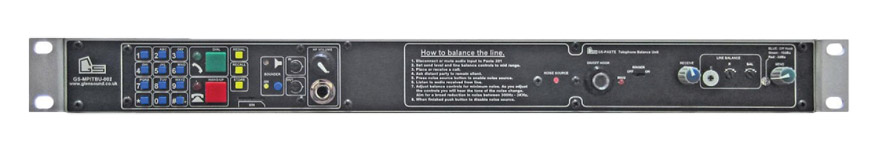This has a mobile phone and a digital telephone hybrid for use with analogue telephone lines (POTS). It offers a means of providing redundancy for an important link or line connection. There is only a single mono input and output: A rocker switch on the front panel selects whether these are connected to the mobile phone or the hybrid. The mobile phone section on the right of the front panel is similar to the phone module in the GS-MPI005, with the overload light absent. The front panel contains the dialling keypad with ten-number phone book and the slot for a SIM card. Two large square buttons are used to dial or hang-up a call, each with LED status indicators. Configurable auto answer may be selected. There are separate level controls for the input and output levels, +/- 10dB. A volume knob controls the level of headphone monitoring of the mobile phone call, connected through an A/B gauge, 6.35mm, jack socket to headphones with 200 - 2000 ohms impedance. The digital hybrid is on the left side of the front panel. A keypad and a single on/off hook switch is used to dial and receive calls. A large green LED illuminates when connected and turns off when disconnected. A sounder, which can be disabled for studio environments, provides indication of incoming calls. There are separate level controls for the input and output levels of the hybrid. The switch to select which link - the mobile phone or the hybrid - is in use is a large paddle switch, located centrally. LEDs indicate which is in use.