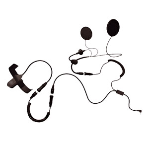 A microphone system developed for transmitting from bike to bike using any type of 'standard' wired transceiver, which may also be of use in theatrical applications and in theme parks. The HM100 system comprises two ultra flat earphones that can be affixed inside most helmets and some costumes, a noise canceling microphone that can be fixed in front of a closed type helmet, and a waterproof PTT switch that can be mounted on the handlebars of the motorbike or fixed inside a 'costume'. Fitted with two-jack 'standard' type plug.