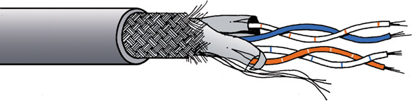 Lay-up: Two pairs of insulated conductors twisted together, laid up with 7/0.2mm tinned copper drain wire, overall aluminium/polyester foil tape screen (aluminium side out) plus 16/7/0.122mm (2 pair) or 16/4/0.15mm (3 pair) tinned copper braid, 65% coverage
