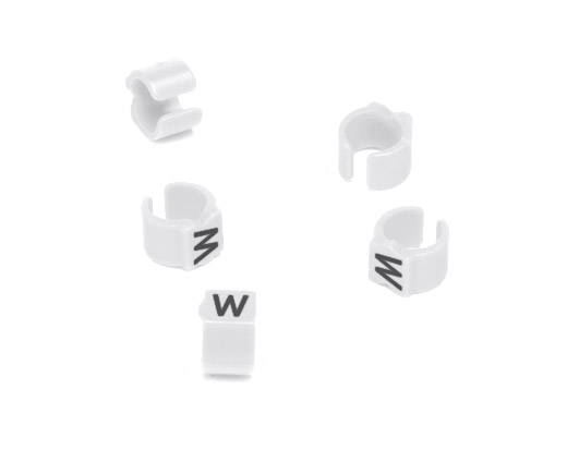 Markers are available with letters printed black on a white marker and numerals 0-9, coloured according to the resistor colour code (RCC) or printed black on a white marker (BW).