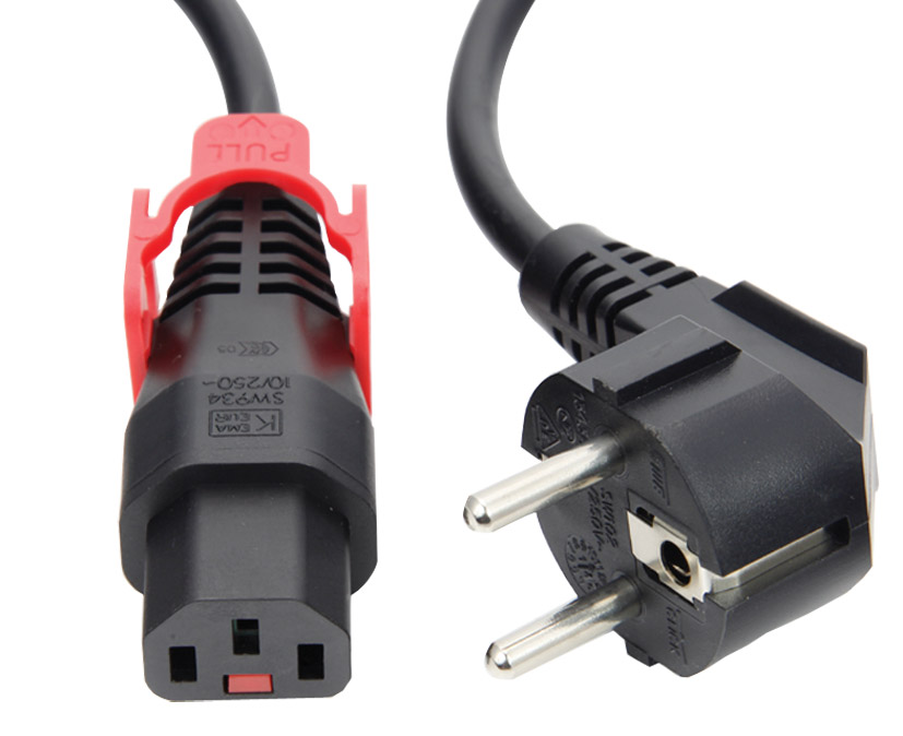 These leads use patented C13 female connectors with an internal locking mechanism which locks in an IEC power inlet, to provide a simple way of securing a power cable to any electrical equipment fitted with a standard IEC connector. They are invaluable for use with critical equipment, either free-standing or rack mounted and in areas subject to vibration such as outside broadcast vehicles, touring and 'fly-away' kit where standard connectors may become dislodged in transit. Ready made cables are offered terminated to standard IEC C14 male plugs, bare ends, and UK 13A and SCHUKO (right-angle) plugs.