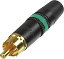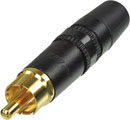 Diecast metal shell, with gold plated solid brass tip and outer contact, black plated body and black strain relief. Chuck type cable clamp and rubber strain relief bush. Colour coding ring in body. Suitable for cable diameters 4.0mm - 6.0mm.