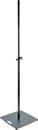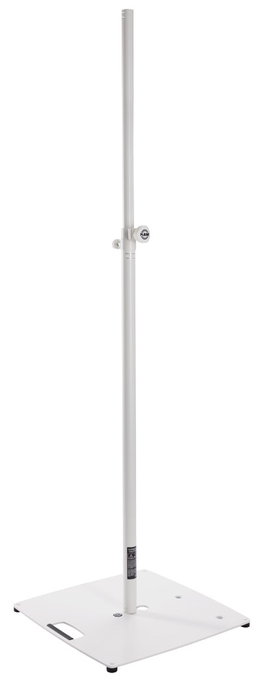 A 35mm diameter speaker stand with flat steel plate measuring 489 x 489mm and weighing 13.38kg in total. The stand has an adjustable height range of 1110-1810mm and is fixed with a safety hook and clamping screw. The base has a central M20 fixing point only. Maximum load capacity is 35kg when fully extended however K&M suggest this is when used on horizontal surface and without lateral forces such as wind or shock. Weight: 13.38kg