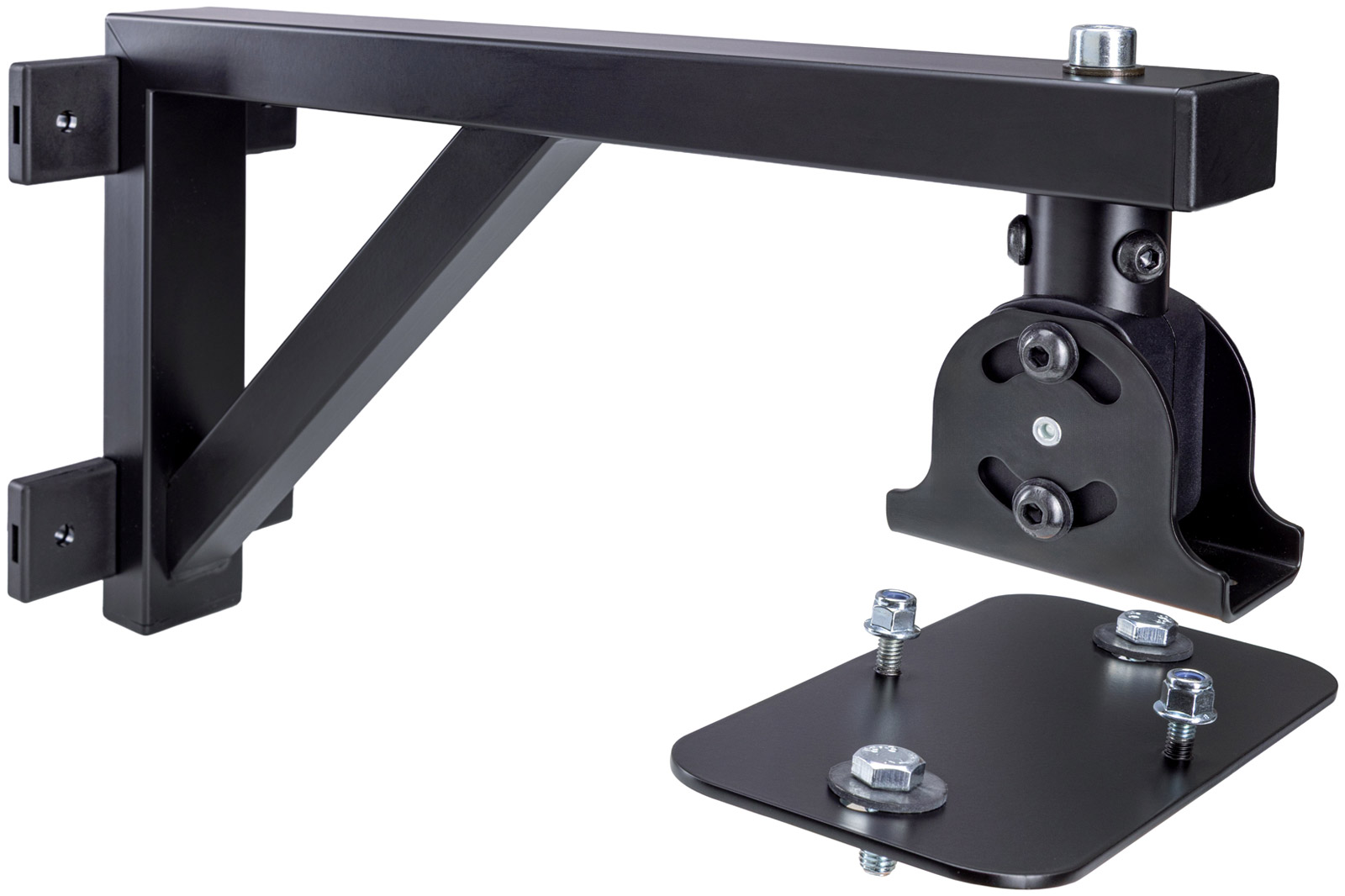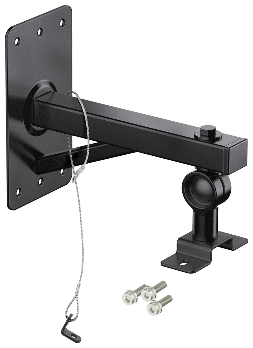 Adjustable wall bracket for smaller loudspeakers. Wall clearance to mounting plate: 105mm. Tilt adjustment of 0 - 15 degrees, swivel adjustment of 180 degrees. Maximum load capacity:10kg. Weight: 0.72kg.