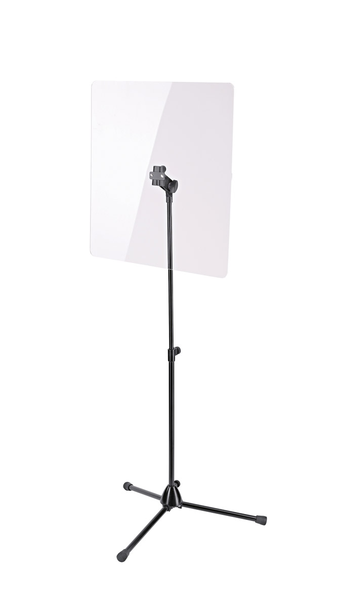 A concave shield manufactured from acrylic glass and measuring 450 x 240mm. The sound isolation shield is attached to the included tripod stand via K&M’s ‘V-block’ connector for quick insertion and release. The steel tripod stand is height adjustable from 900-1400mm and has a diameter of 670mm.