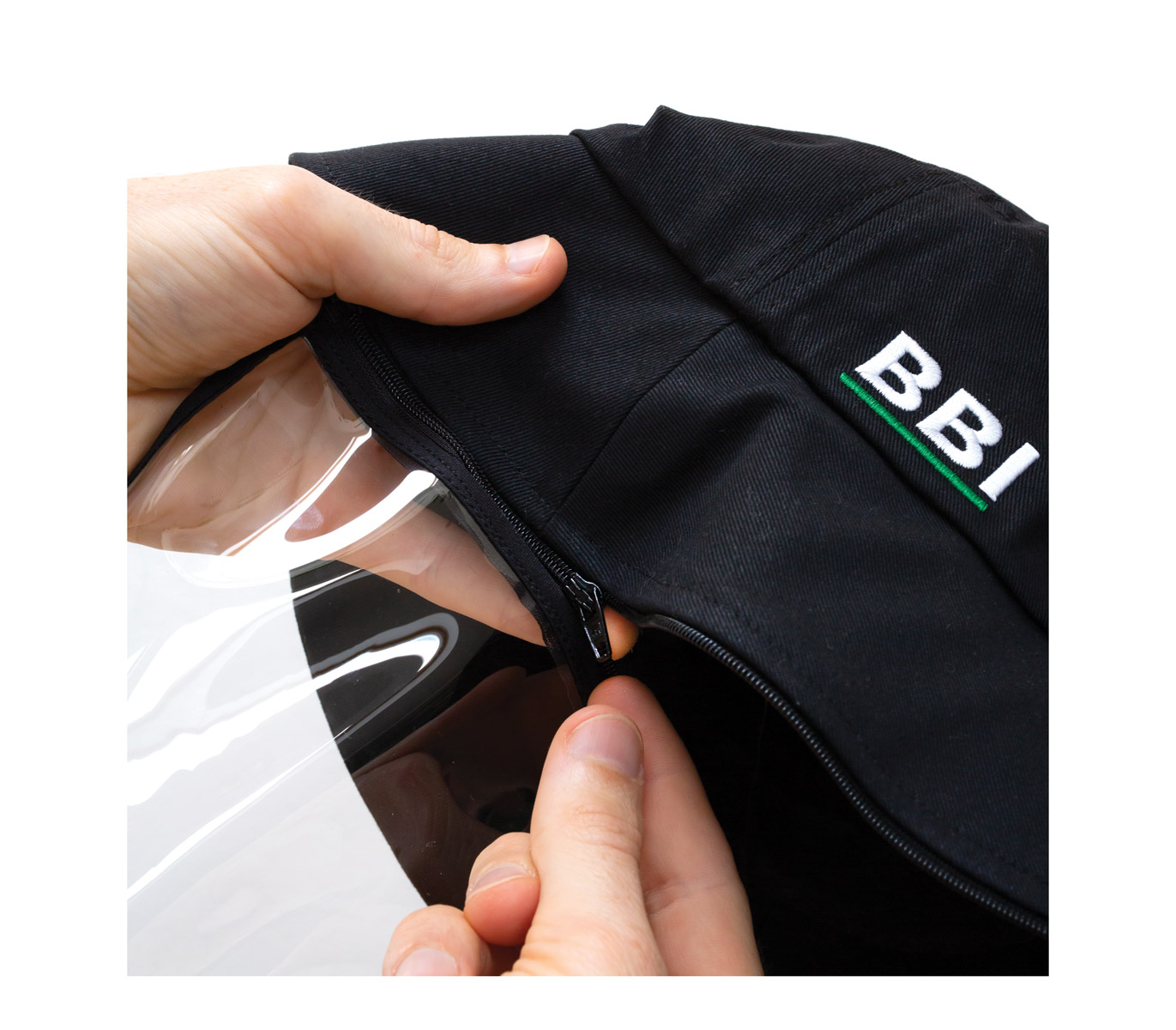 Visor Cap Wide is a baseball cap with hidden adjustable ribbon strap. It is manufactured from 100% cotton and it allows the user to fix the included TPU (Thermoplastic Polyurethane) visor via a zip positioned around the brim of the cap. The visor has been manufactured from non-toxic material that can be cleaned using soap and water.