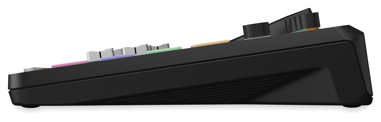The main panel of the production studio houses a 5.5-inch, high-definition touchscreen with haptic feedback. From this screen the user is able to monitor inputs, outputs, active DSP, timeline, and scroll/select menus to set up. A rotary encoder aids menu navigation and control. Nine channels, including six physical faders and three virtual faders can be individually assigned, and eight SMART pads can be fully programmed to trigger sounds, voice effects, MIDI commands, and mixer actions. Four rotary controls allow the setup of headphone output level, and an illuminated ‘Rec’ button is ergonomically placed for access.