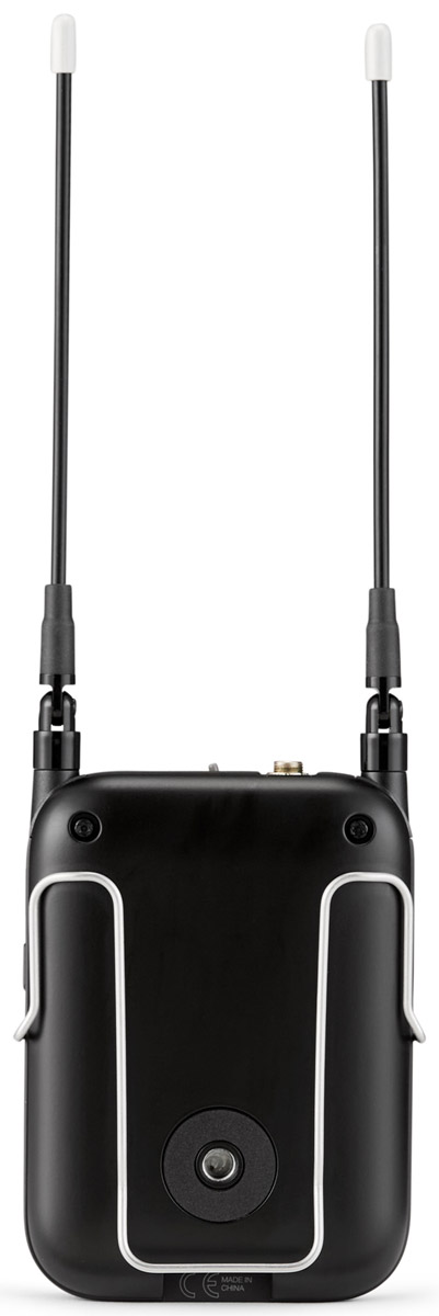 Manufactured from PC (Polycarbonate) and ABS (Acrylonitrile Butadiene Styrene) plastic, SLXD1+ belt pack transmitter has many of the features the handheld transmitter offers, however has a fixed whip antenna and 4-pin TA4F connector for use with optional WL185M, WL93, XM153, SM35, or WA305. SLXD1+ has charging contacts for docking and charging with optional SBC203 battery charger, and can be powered using either 2x AA battery cells or a single SB903 rechargeable lithium battery pack. When the SB903 lithium-ion battery is employed, the user gains access to battery charge status in hours and minutes, along with battery life and health status.