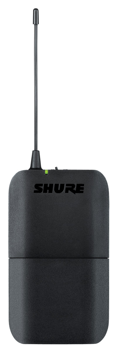 Shure BLX1 beltpack transmitter has all the functionality of the BLX2 handheld transmitter, however it is designed to be used with plugin microphones including SM31FH or SM35 headworn microphones, MX153 mic, or CVL lavalier mic. All function buttons are located within the battery compartment, which also uses two AA alkaline battery cells for operation up to 14hours. The upper edge of the beltpack transmitter has a fixed whip antenna, and 4-pin TA4 microphone input.