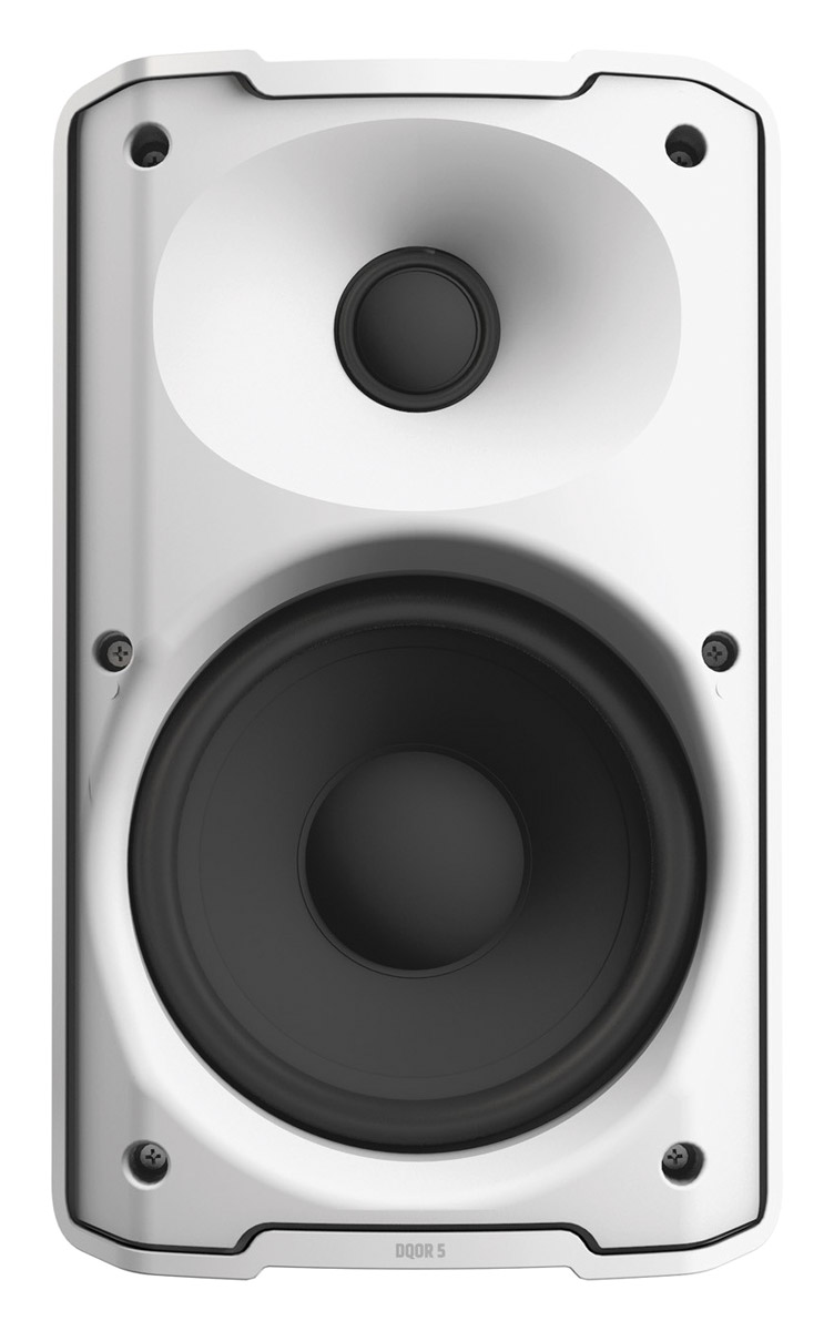 Available in black or white and supplied as a pair, DQOR 5 is a passive loudspeaker for indoor or outdoor use. The 2-way speaker has an IP55 rating and features a 'corrosion-resistant' aluminium grille, 5-inch weather treated paper cone woofer, and 1-inch neodymium high frequency driver. A frequency response of 74Hz to 20kHz and SPLs of 84dB at 1W/1m and 105dB maximum are complimented by a dispersion of 120 x 80 degrees (H x V) at -6dB. RMS output is 70W and peak power is 140W. The included surface mount bracket allows positioning of up to 27 degrees tilt and 45 degrees horizontal swivel. Connection is via 4-pole terminal block housed within the surface mount bracket, which also acts as signal inlet.
