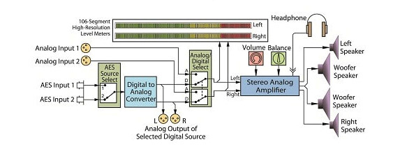 A 6.35mm headphone jack with associated volume control is positioned on the front facing panel. When the headphone output is in use, the speakers are muted automatically. Other than the headphone output on the front facing panel, all I/O connectivity is on the rear facing panel; including 2x unbalanced BNC AES/EBU digital inputs, 2x balanced 3-pin XLR analogue inputs (1 stereo), and 2x balanced 3-pin XLR analogue output of selected source.