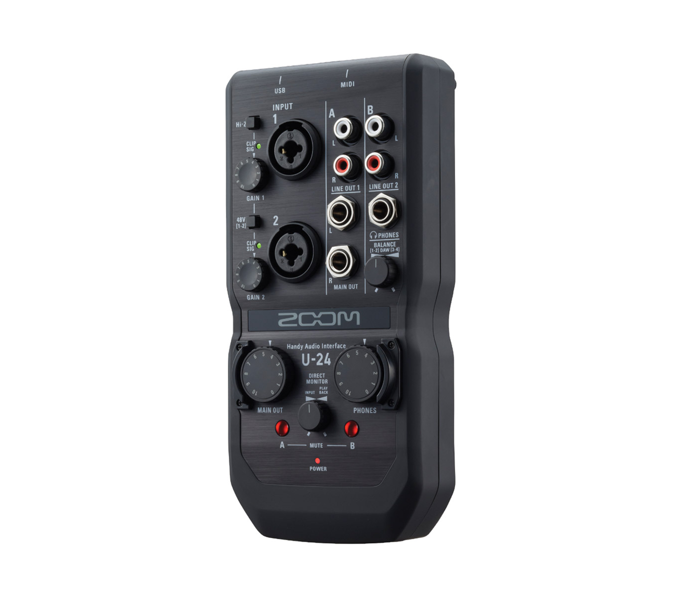This audio interface has the same features of the U-24, however in addition to inputs one and two, an optional Zoom microphone module can be connected and used for microphone inputs three and four – offering four-channel simultaneous inputs. The left side of the U-24 also has S/PDIF connectivity via optical TOSLINK I/O and RCA coaxial connectors.