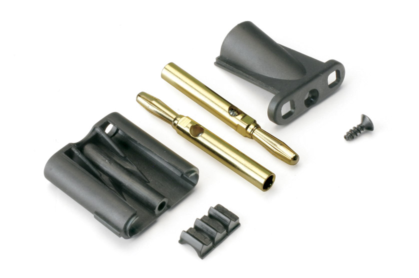 Moulded dual 4mm connectors, with pins at the industry standard 19mm spacing. Gold plated brass pins, with screw connection accepting conductors up to 4 sq.mm. The contact probe features four leaf springs (also known as 'lantern spring') design for secure contact, and is stackable.