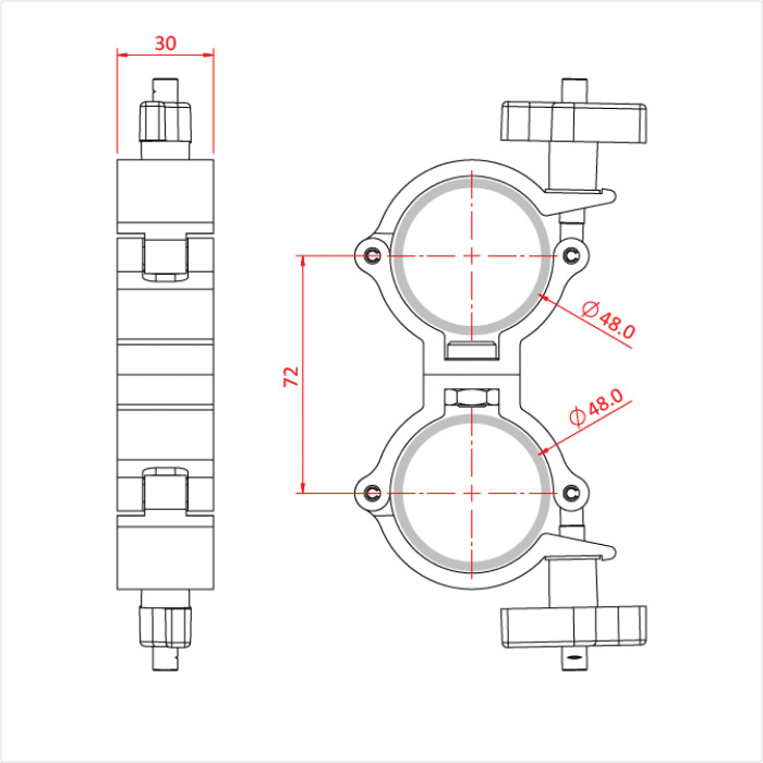 A series of aluminium, extended pipe to pipe couplers designed for suspending tubes or trussing where and additional reach or drop is desired. All designed to fit tube diameter of 48-51mm. Note: these couplers are designed for vertical loads only.