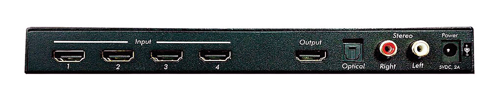 The front panel of the metal enclosure has status LEDs to signify power, HDMI channel select, and audio channel select. The rear of the unit houses all input/output connectivity including HDMI connections, optical (Toslink), dual RCA connectors and 5V DC power supply input.