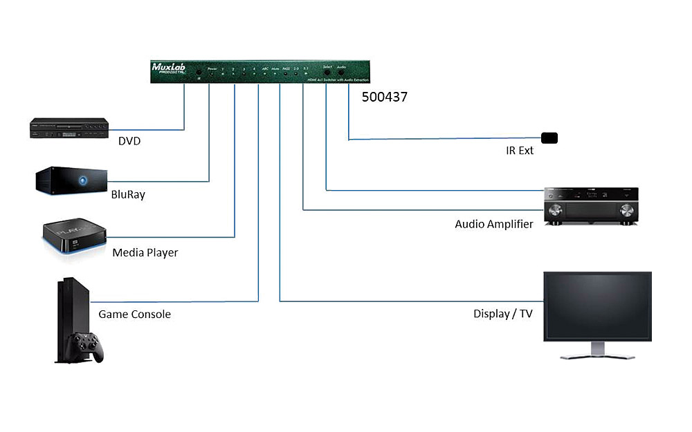 MUXLAB 500437 HDMI SWITCHER 4x1, HDCP 2.2, 4K/60, optical, stereo RCA phono, audio extractionMUXLAB 500437 HDMI SWITCHER 4x1, HDCP 2.2, 4K/60, optical, stereo RCA phono, audio extractionMUXLAB 500437 HDMI SWITCHER 4x1, HDCP 2.2, 4K/60, optical, stereo RCA phono, audio extraction