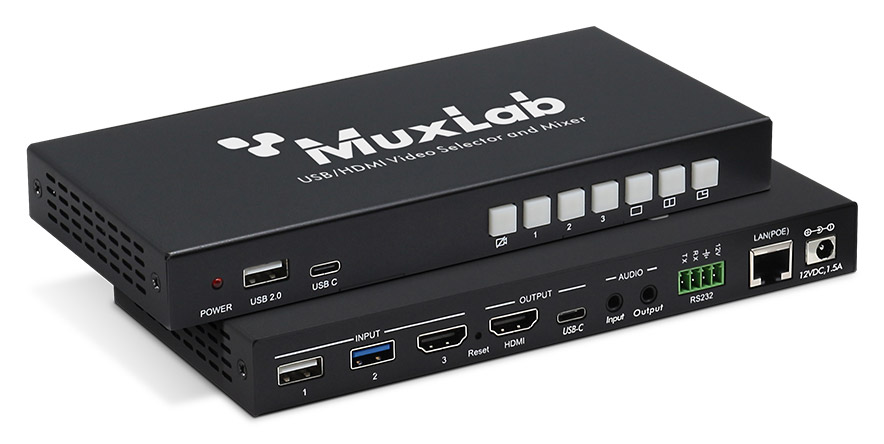 Designed for conference rooms or centres, hotels and education, Muxlab 500882 is a USB and/or HDMI video selector and mixer that enables switching between three sources including 1x USB 3.0, 1x USB 2.0 and 1x HDMI. Two of the signals can then be mixed into one image, providing a single HDMI output for local monitoring, and a single USB-C output for the computer to perform web conferencing or live broadcasting. The unit may be managed locally via front panel push buttons, RS232 and over an Ethernet network, and includes a 12VDC power supply. Also supports PoE.