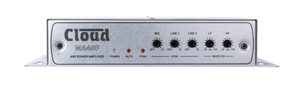 The MA40T mini amplifier has all the technical attributes of the MA40F except that instead of a 40W output into a 4 ohm load, the MA40T is a 40W amplifier with a transformer enabling it to drive 25/75/100V line speakers.