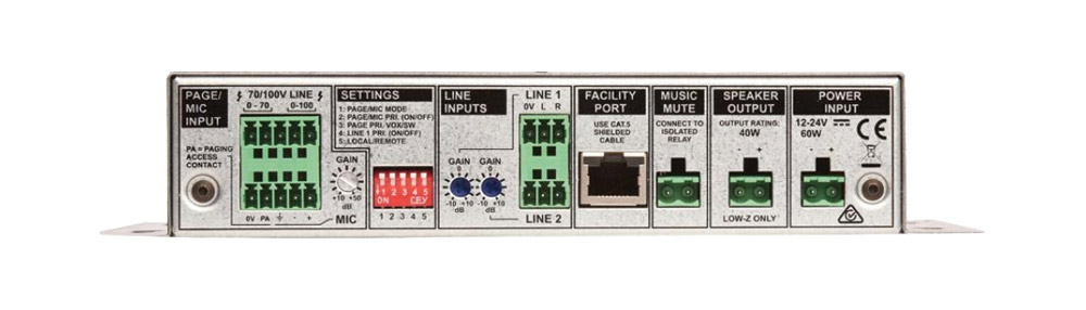This mono amplifier has two unbalanced stereo line inputs and one electronically-balanced microphone input. When using an external 24V mains power supply, the amplifier has a 40 watt output capability. It can also be powered via a 12-24V DC power supply however the maximum output is reduced when the input voltage supplied falls below 18V. All inputs and outputs use detachable, screw terminal connectors.