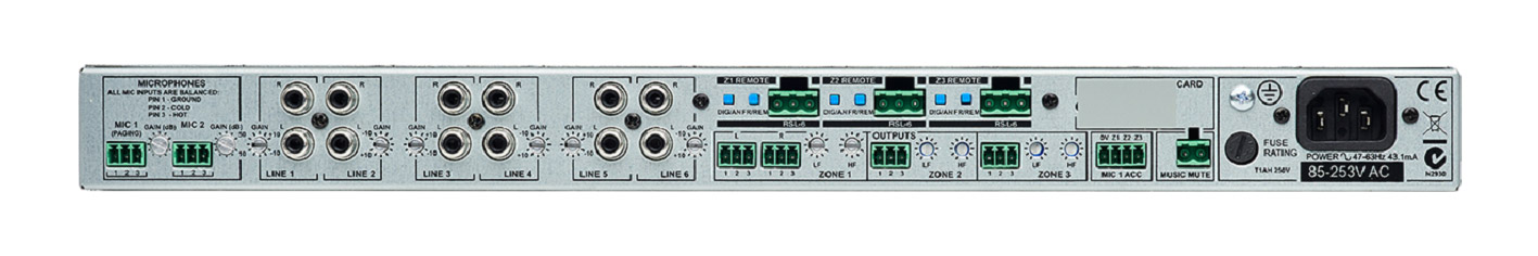 Two stereo unbalanced line level inputs are available via RCA (phono) sockets and four stereo balanced line level inputs via 'Euroblock' connectors. Gain controls are available for each input. These 'music' input pairs are summed individually to mono. There are also three balanced microphone inputs, all three with +15V phantom power available: Two have pre-set gain and level controls on the front panel, whilst the third is a dedicated paging-microphone input with pre-set level on the front panel, with zone-routing facility and full priority. All connections use removable Phoenix-style 'Euroblock' terminal block connectors, unless specified otherwise.