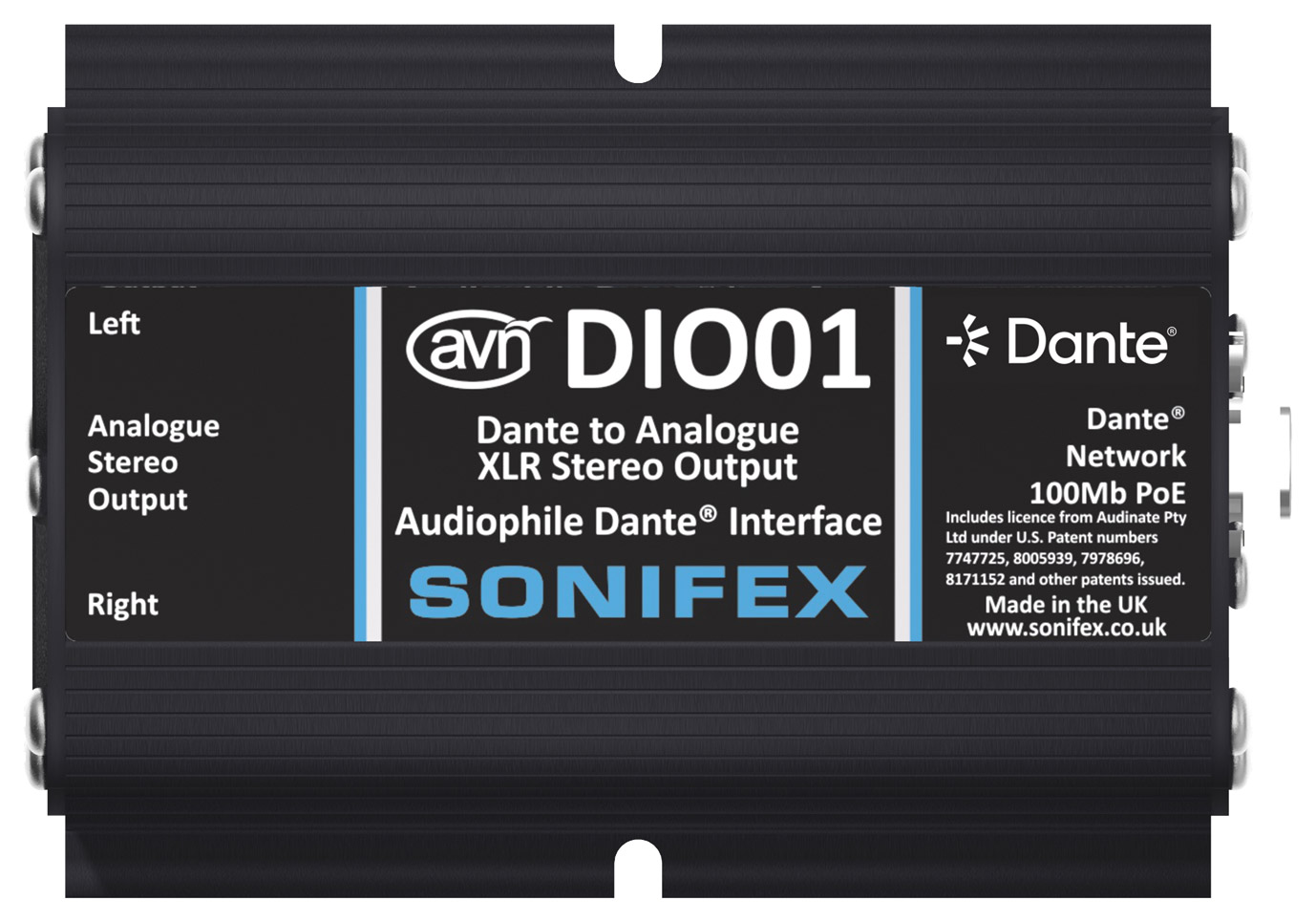 DIO01 offers Dante AoIP network audio input to stereo audio output on 2x balanced 3-pin XLR connectors, and is AES67 compatible. The input is by way of single Neutrik EtherCon connector, which also allows for PoE (power over Ethernet). The analogue to digital and digital to analogue circuitry offers 120dB of dynamic range. Sample rate compatibility includes 44.1kHz, 48kHz, 88.2kHz, and 96kHz, with PCM16/24/32 encoding.