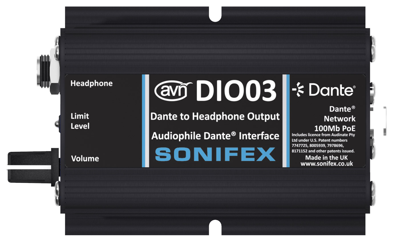 DIO03 is a Dante AoIP network to headphone output convertor. The Dante input, by way of Neutrik Ethercon connector is joined by headphone outputs of unbalanced 6.3mm and unbalanced 3.5mm jack. A potentiometer positioned on the front facing panel allows headphone volume output from muted up to +6dB. An inbuilt limiter, designed to prevent hearing damage, can be adjusted using a trimmer adjustment tool or flat bladed screwdriver. A blue LED illuminates to illustrate limiting in progress. The limiter can be set from -12dBu to 0dBu. The analogue to digital and digital to analogue circuitry offers 120dB of dynamic range. Sample rate compatibility includes 44.1kHz, 48kHz, 88.2kHz, and 96kHz, with PCM16/24/32 encoding.