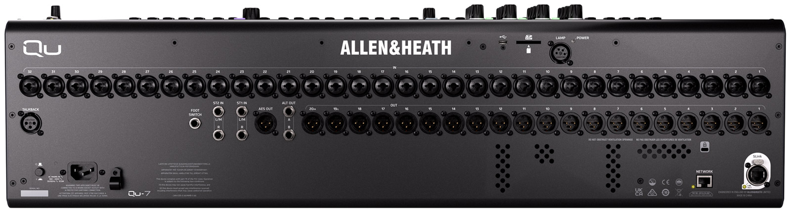 Qu-7 and Qu-7D are the largest console in the range with 38-input, 24-output. The consoles have 33x 100mm faders, 32x mic/line combination inputs, and 20x balanced 3-pin XLR outputs. A single 3-pin XLR connection allows for talkback, whilst 2x 6.35mm TRS jack connectors are included as additional output connections. A single AES3 digital audio output is provided by way of 3-pin XLR connection, and an SLink connection via RJ45 EtherCon for optional Everything I/O series expanders. See ALLEN & HEATH EXPANDERS - Everything I/O Series A 12V lamp socket is positioned to the upper right side of the rear facing panel.